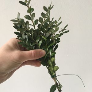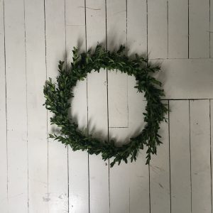 For my next wreath I went larger and opted to use only boxwood. While making wreaths this way is quite simple to do, it is still time consuming. Plan accordingly. Two bundles of branches made one small wreath (approx. 7 inches), 2 large wreaths (13-15 inches–my friend Alanna made the second) and one long garland for my front window (10 feet long).