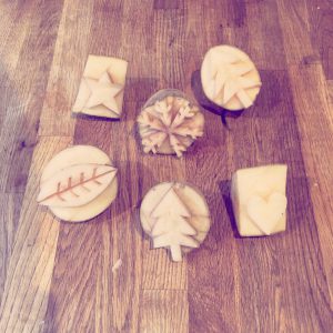 First off, cut the potatoes in half or in thirds (depending on how big you’d like the stamps to be). You can draw the shapes on beforehand if you dry the potato a bit or go free style (which I did). You can also press the shape of a metal cookie cutter into the potato and then carve it out.