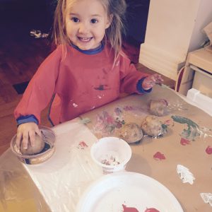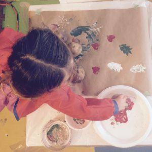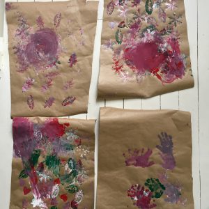 She got into it immediately and actually made 4 full sheets of paper. She even used the stamps right up until the last sheet where she felt it necessary to get her hands right in the paint instead. This meant we got some equally lovely handprint paper (although not going to lie, her hands caked in paint gave me stress palpitations). This might sound awful, but it hadn’t occurred to me just how beautiful it would be. I love how all the colours looked blended and marbled together. I did some of the stamping too, but it was totally driven by her and the result is pretty special!