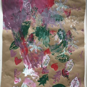 The next day, Leni and I pulled out the stamps and rolled some kraft paper on her table over a plastic sheet, securing it with painters tape to keep it from curling. We went with some festive red, green and white paint. Obviously.